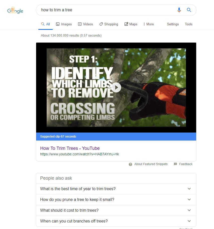 Google is the biggest search engine out there right now, but a lot of people forget that YouTube has its own search engine and is integrated with Google. This means when doing a search on Google you might be presented with a video result hosted on YouTube. If you search “How to trim a tree” on Google, the search result below appears. So, the top result is a video hosted on YouTube. Especially “How to” search queries will often prompt a video result.
