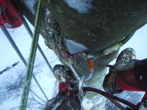 When we block Down a spar, we use this system, where the climbing line is tied around the stem as a backup for the lanyard - as most climbers, I know, use.